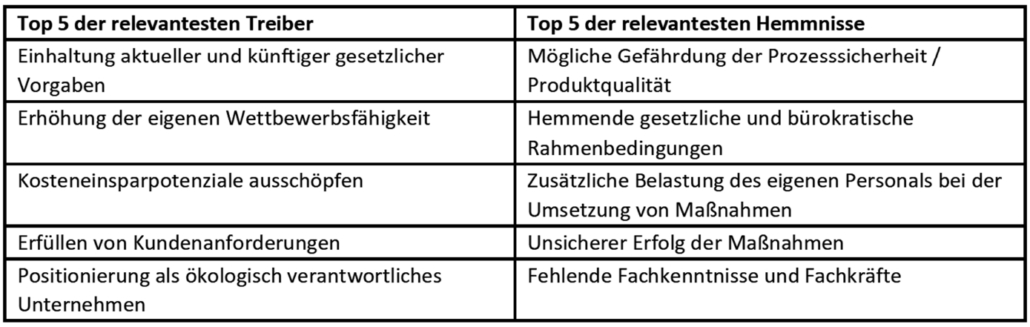 Tabelle 1: Top 5 der relevantesten Treiber (links) und Hemmnisse (rechts) für die Umsetzung von Maßnahmen in Unternehmen (n = 1.002) (7)