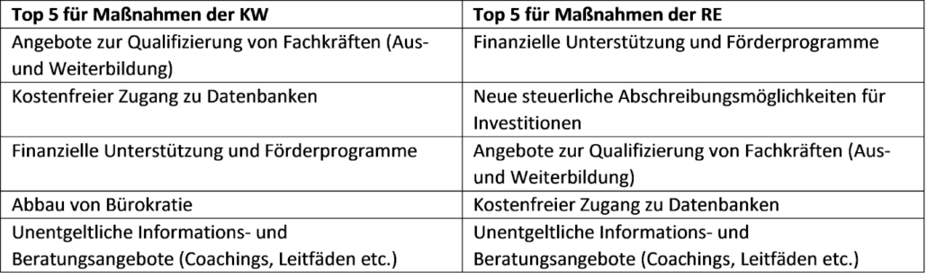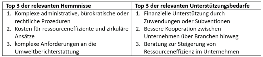 Ein weiterer Teil der VDI ZRE-Studie umfasste die Frage nach Unterstützungsbedarfen, die KMU für die Umsetzung von Maßnahmen sehen. So sind insbesondere Angebote zur Qualifizierung von Fachkräften sowie finanzielle Unterstützung und Förderprogramme gewünscht. Kostenfreier Zugang zu Datenbanken zählt neben unentgeltlichen Informations- und Beratungsangeboten zu den Top 5, ebenso wie der Abbau von Bürokratie und neue steuerliche Abschreibungsmöglichkeiten für Investitionen. Vor diesem Hintergrund scheinen finanzielle Mittel und Angebote zur Qualifikation von Mitarbeitenden der Schlüssel zur Umsetzung von KW und RE in Unternehmen zu sein. Diese Ressourcen zu stärken beziehungsweise durch bürokratiearme rechtliche Regelungen zu schonen, stellt somit eine essenzielle Unterstützung von Seiten der Politik für Unternehmen dar.