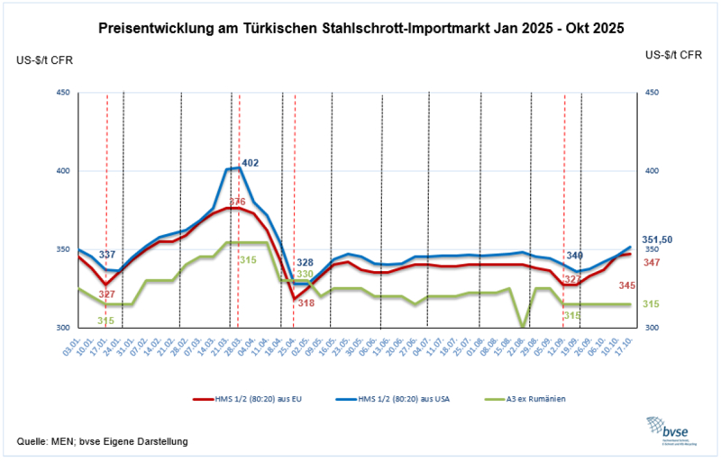 Ende der zweiten Oktoberwoche wurden einige Verkaufsabschlüsse auf höherem Preisniveau bekannt, darunter Lieferungen aus den USA, aber auch aus Dänemark, Schweden, Estland und Belgien. Nach relativ schleppenden Einkaufskampagnen in den Vormonaten stockten türkische Werke ihre Lagerbestände für die Lieferung im November auf. Die Werke erkannten an, dass steigende Frachtkosten und eingeschränkte Materialzuläufe zu diesem Marktpreisniveau führten. Ein türkisches Werk kaufte eine HMS 1/2 (80:20) aus Deutschland zu 346 $/t und eine niederländische Partie zu 344 $/t CFR Türkei. Beide Chargen waren Marktteilnehmern zufolge für die Novemberverladung vorgesehen.