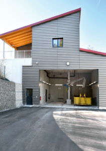Entwässerungsgebäude der Kläranlage Parsberg mit Abhol­bereich der Container