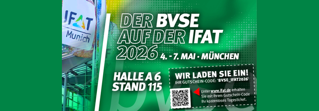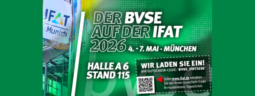 Mit insgesamt 16 Mitausstellern präsentiert sich der bvse am Stand A6/115 auch im Jahr 2026 als zentrale Plattform für den Mittelstand der Recycling- und Entsorgungswirtschaft – nicht nur für die rund 1.100 Mitgliedsunternehmen, sondern für alle an der Branche Interessierten. Der Messestand bietet Raum für Gespräche, Kooperationen und strategische Vernetzung. Kostenfreie Messetickets können mit dem Code BVSE_IFAT2026 über die IFAT-Anmeldeseite angefordert werden.