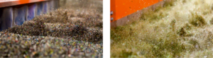 Der VARIOframe kann mit verschiedenen Siebbelägen ausgestattet werden, hier zum Beispiel hochgezogene Beläge für geschredderte Kabel (links) oder mit Schleißauskleidung für Altglas (rechts)