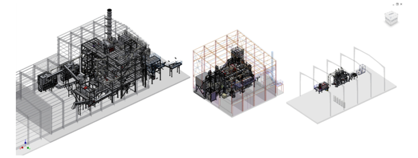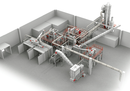 Je nach verfügbarem Bauraum und Prozessanforderung werden mittelgroße Anlagen modular aufgebaut. Dabei kann, abhängig vom Materialstrom und der gewünschten Prozessabfolge, sowohl eine vertikale als auch eine horizontale Struktur sinnvoll sein. Sie eignen sich für die meisten industriellen Anwendungen und lassen sich flexibel in vorhandene Gebäudestrukturen integrieren.